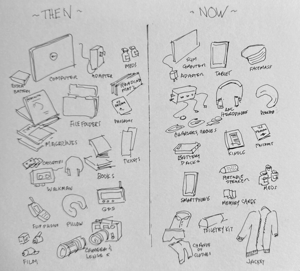Third, travelers themselves changed. We carry more electronics, more batteries, more cables, and more must-not-lose items; even a change of clothes should our rollerbag be checked and lost. The under-seat zone has become the place for the essentials: laptops, passports, medication, chargers, noise-canceling headphones, tablets, Kindles, snacks, travel pillows, and the other gear that makes a long-haul flight tolerable. The overhead is now for clothes; the under-seat is our survival kit.