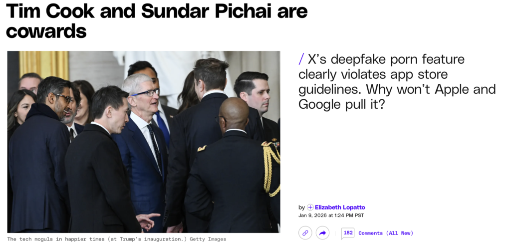 The piece lays out a simple, uncomfortable truth: Apple and Google loudly advertise their values — safety, responsibility, protecting users — yet refuse to enforce their own rules when doing so might anger powerful people or create political blowback. In this case, the issue is the continued presence of an app on their platforms that has been linked to the spread of nonconsensual, AI-generated sexual images. Content that clearly violates both companies’ stated policies remains available because taking action would require spine.