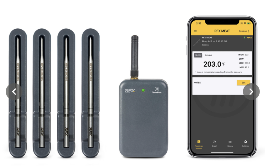 I’ve found the best of the bunch, based on reliability, value, and performance to be the ThermoWorks RFX model. It uses a more robust communications band and is much more affordable when buying multiple probes, about $50-$60 each. ThermoWorks also often runs frequent sales.