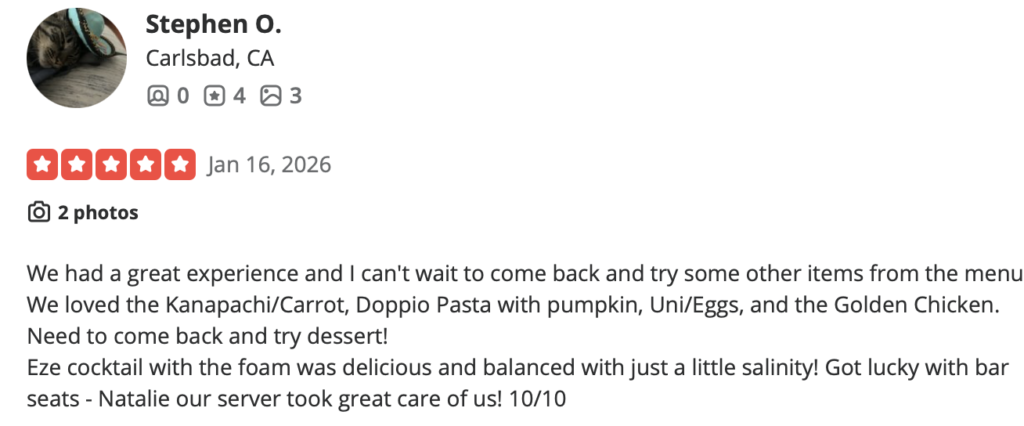 In this example below of a hot new San Diego restaurant, whose ratings have been less than expected, note that the latest cluster of reviews are all new accounts with very few prior reviews (the center number under reviewer’s name), and they were all posted around the same date. Now it may just be a coincidence, but maybe not. When using Yelp, I always change the sort option from Yelp sort to Latest, so I’m seeing the most recent reviews.