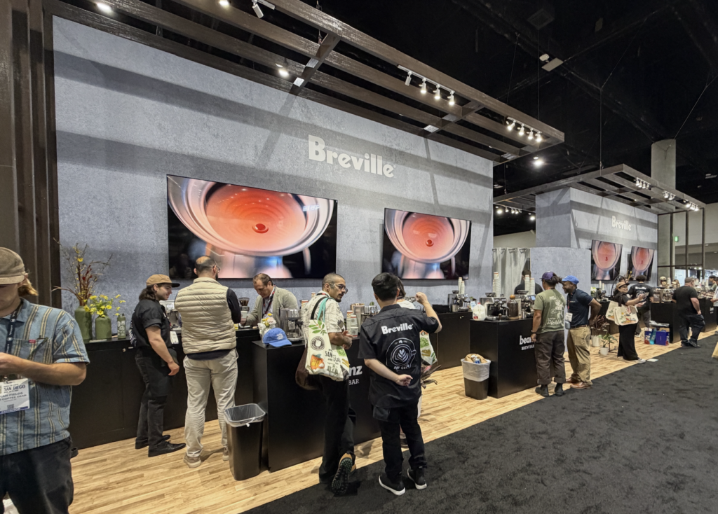 As a coffee lover – I roast my own coffee using a twelve year old Gene Cafe home roaster and use my La Marzocco Mini home machine everyday – I’m familiar with much of the home equipment, an area that seems to be booming. Breville, one of the most successful makers of home equipment, had a big display showcasing its line of semi-automatice espresso machines and it’s new Baratza Grinder acquisition. Fellows, a company known for its modern looking coffee equipment showed thir first espresso machine.